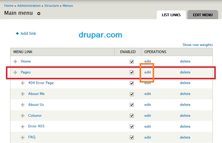 - Click edit link of the link which you want to make as parent link.