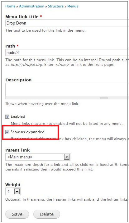 - Enabled Show as expanded for this parent link and save the link.