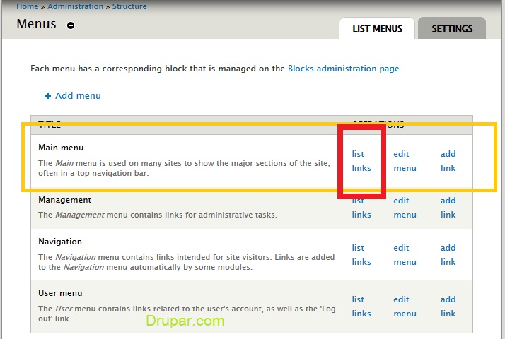 - Click list links to see all links that you have in Main menu.